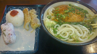 かけうどん中、ハムカツ、アスパラ、日の丸おむすび、ゆかり、ちくわを頂きました[#IMAGE|S19#]